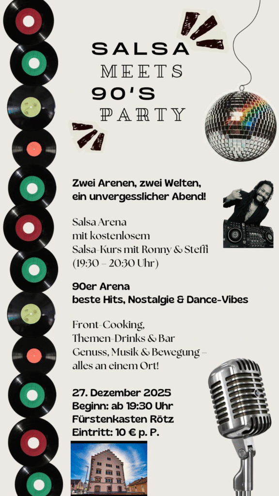 Gratis Salsa-Kurs, Dance-Vibes, Hits der 90er & leckeres Essen – alles in einem Event!