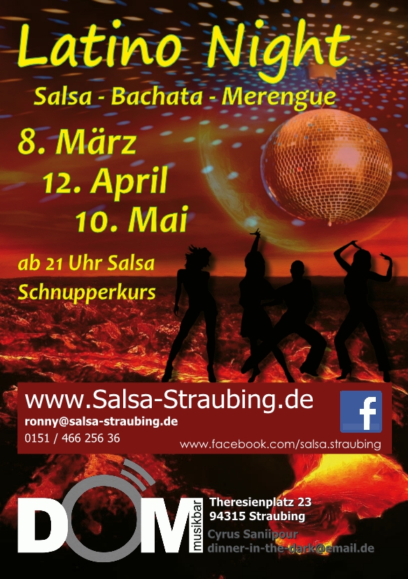 Salsa Party im DOM Jeden 2. Samstag im Monat Cuba € 5,20 // Mojito € 6,50 // Caipi € 6,00 (all night long) mit Special DJ ab 21 Uhr kostenloser Schnupperkurs (bis 22 Uhr) DOM Musikbar | Theresienplatz 23 | 94315 Straubing Weitere Informationen http://www.salsa-straubing.de